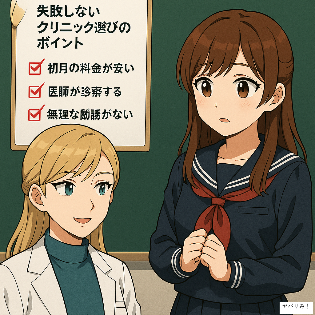 • 高額なオリジナルサプリや施術をセットで売る: 世界的に効果が認められているのは内服薬だけなのに、効果が不明なオリジナルサプリや高額なメソセラピー施術をセットで契約させようとするの。これは患者のためではなく、クリニックの利益のためよ。