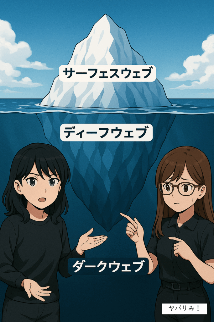 - サーフェスウェブ(表層Web): GoogleやYahoo!などの検索エンジンでアクセスできる、一般的なウェブサイトです。このブログ「ヤバりみ!」も、あなたが今見ているYouTubeやAmazonも、この層に属します。インターネット全体のわずか5%ほどと言われています。