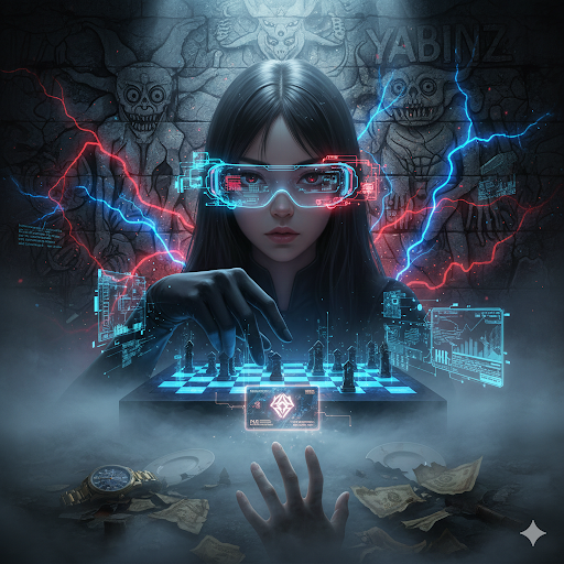 金髪で眼鏡をかけた知的な女性ナジカが、霧に包まれたガラス状のチェス盤上で駒を動かそうとしている。背後には古代の怪異を刻んだ石壁と青赤に発光するデジタル回路が融合し、神話とサイバーノワールが交錯する緊張感あるシーン。 お金と副業
