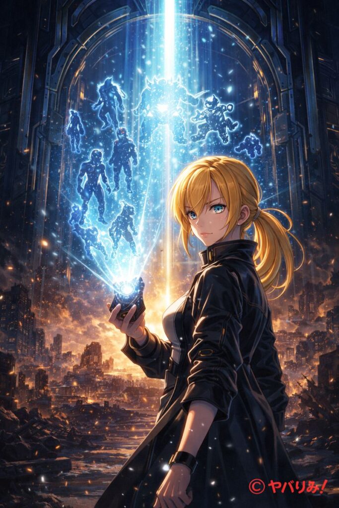 巨大なホログラム空間の玉座に座る金髪のナジカ。冷静で鋭い青い瞳をこちらに向け、未来的なスーツ姿で堂々と腰掛けている。背後には無数のYABINZカードが光の壁となって浮遊し、デジタル都市のような青い情報の奔流が広がっている。全体はSF的で荘厳な雰囲気に満ち、新しい経済圏と物語の支配者を象徴するビジュアル。右下に赤字で©ヤバりみ!が表示されている。